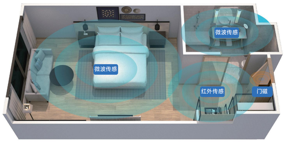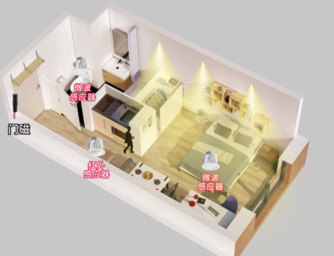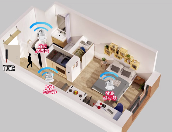 通过采用微波+红外,在走廊区域使用红外传感器,在卫生间和床尾使用微波传感器,这样能够很好的结合微波和红外的优点,更精准的检测房间内是否有人。