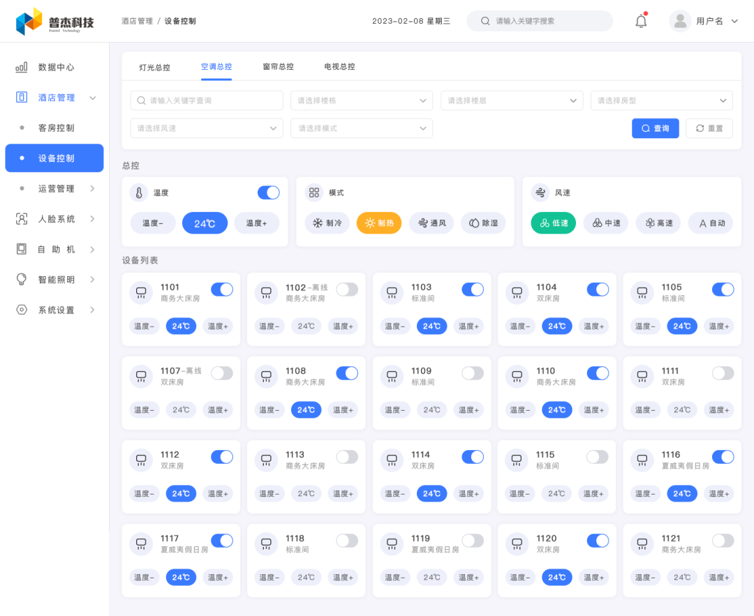 在设备管理维度,可实现对酒店客房内用电设备的集中化、标准化管控。系统后台能实时抓取各房间内空调、灯具等设备的运行参数与工作状态,形成可视化设备管理面板,管理人员无需逐一巡查客房,即可远程掌握全酒店设备的运行情况。
